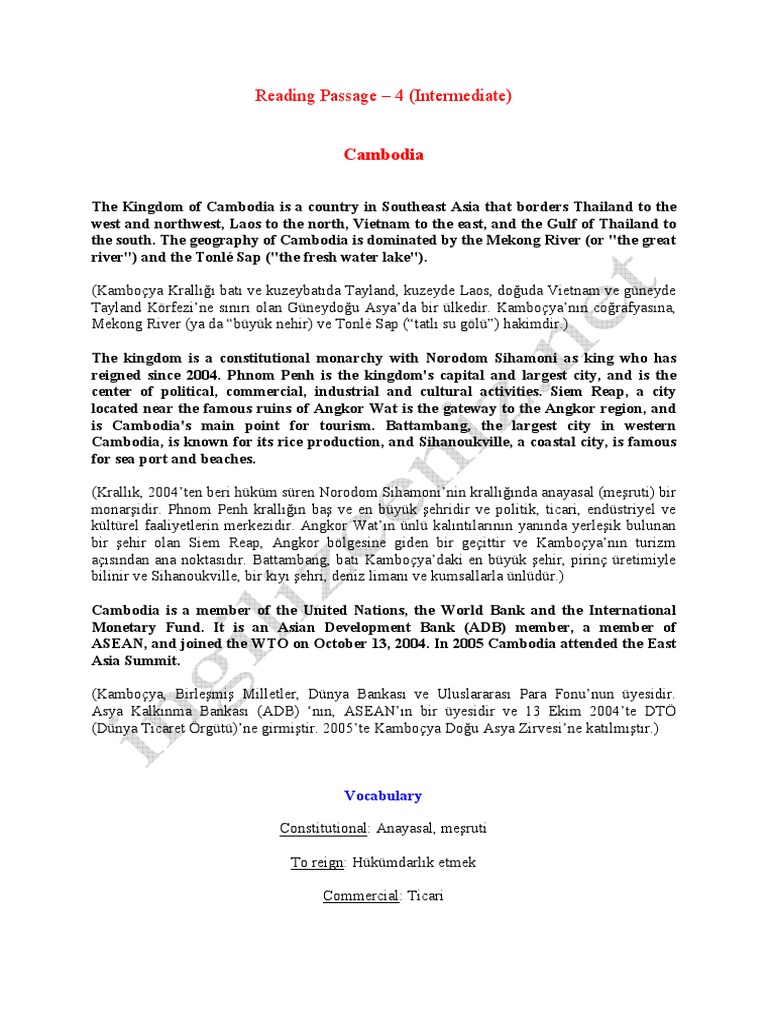 Bunlardan bir tanesi, otel reklamları gibi aynı konuya bağlı 6-kısa metin şeklinde bileşik bir metin olabilir. Konular, İngilizce konuşulan bir ülkede geçebilecek günlük konuşmalarla ilgilidir.